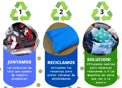 1- Economía circular: reutilizamos todos los recortes y descartes de lonas, hilos, espuma, etc., en la fabricación de almohadones para uso de cama de mascotas; que son donados a rescatistas de perros y gatos, o vendidos a precios simbólicos en ferias y/o eventos náuticos.